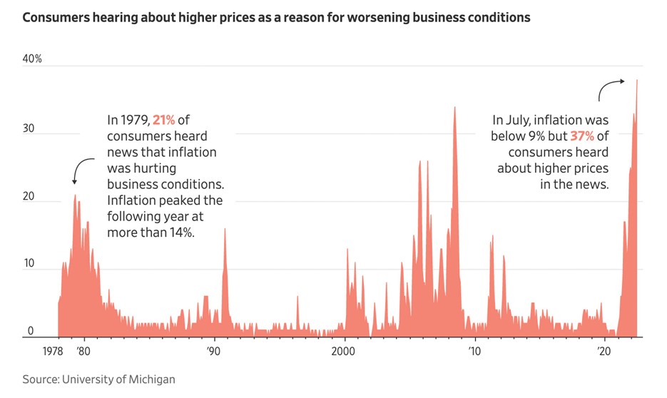 Some argue that widespread media coverage of inflation may be contributing to the current pessimism. The chart below illustrates the difference between inflation levels and coverage today compared to the late 1970s.